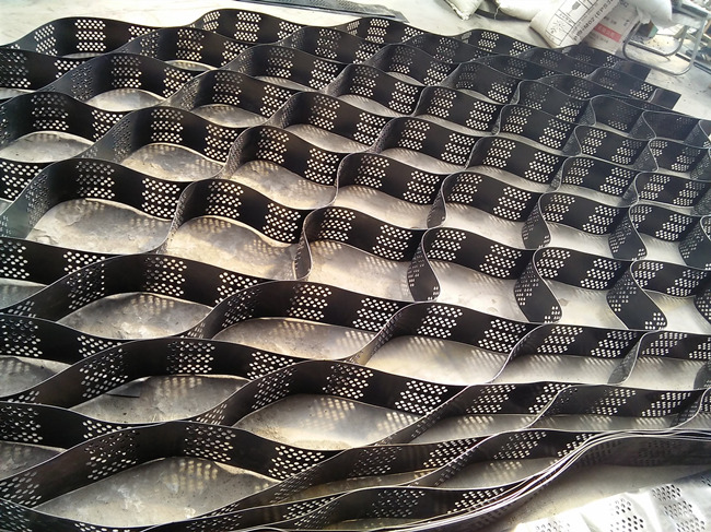 土工格室是由強化的HDPE片材料,經高強 力焊接而形成的一種三維網狀格室結構土工格室。一般經超聲波針式焊接而成。因工程需要,有的在膜片上進行打孔。